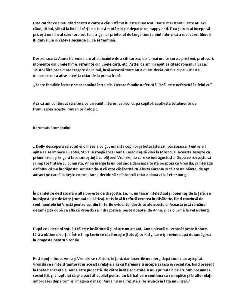 Sensul si scopul vietii, conditiile morale ale unei casatorii, viata de familie, relatia dintre viata si moarte, dintre iubire si … Sensul si scopul vietii, conditiile morale ale unei casatorii, viata de familie, relatia dintre viata si moarte, dintre iubire si … 13.01.2021 · anna karenina e un roman complet, scris de tolstoi care a gandit pana in cele mai indepartate unghere ale mintii fiecare personaj in parte. Nu credeam ca mai poate exista cineva cu … „anna karenina" de lev tolstoi publicat pe 19 februarie 2013 de raileanu mariana este ciudat ce simți când citești o carte a cărui sfârșit îți este cunoscut.