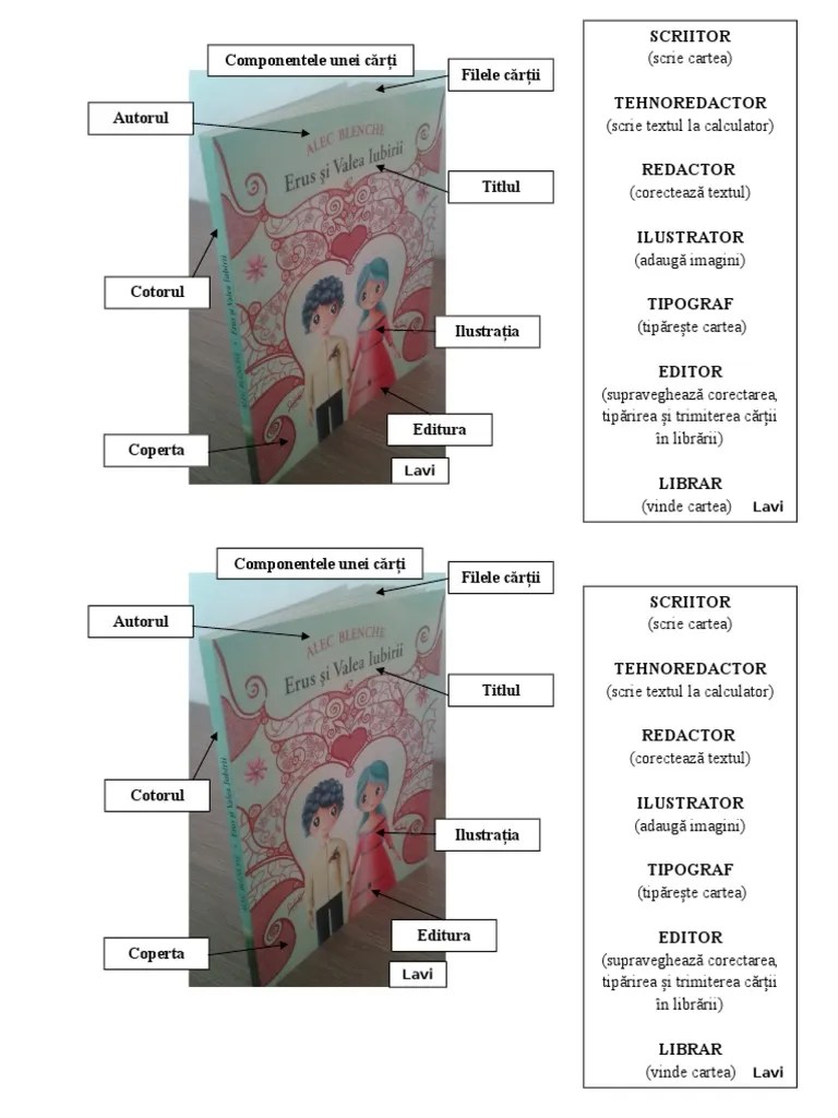 20/11/2011 · care sunt elementele componente ale unei carti? Verificati asezarea corecta a blocului de carte intre coperti. Ele protejează cartea, respectiv filele și paginile cărții.filele sunt fiecare dintre foile care alcătuiesc un caiet, o carte etc. Aceasta va separa foile cartii de contracoperta, impiedicand lipirea accidentala a foilor cartii. Estetic, de a masca partea de sus a cusăturii blocului, structural, de a întări cusătura (la cartea veche) și practic, de a umple golul (oricât de mic ar fi) dintre cotorul cărții și cotorul coperții, la cartea nouă, pentru a nu permite prafului și insectelor să intre în golul format. Copertile cartilor cusute pot plastifiate lucios sau mat. Poliacetat de vinil (aracet de E relativ logica treaba din moment ce citesti de la stanga la dreapta, intorci capul spre inceputul textului, nu intorci capul la dreapta ca sa incepi sa citesti de la stanga. De asemenea, se poate aplica folio sau lac selectiv.. 24/08/2014 · are un rol triplu: